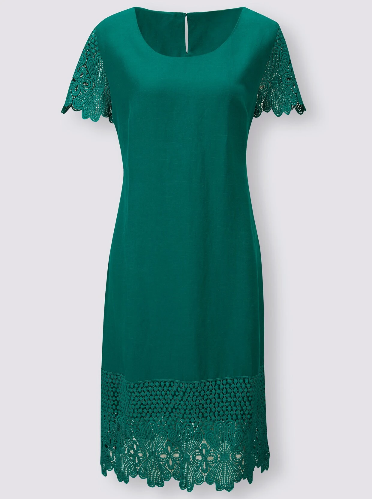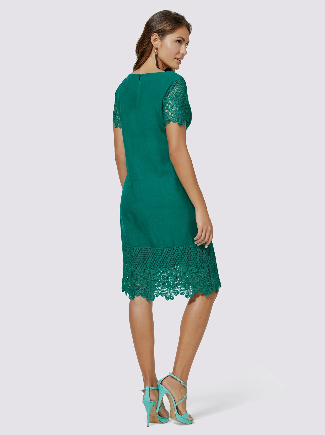 Das Kleid in hochwertig gewebter Lyocell-Leinen-Qualität fühlt sich ausgesprochen weich an und trägt sich luftig leicht. Ihre dezente Leinen-Struktur schimmert matt im Licht und ist an den Ärmeln und am Saum mit opulenter Spitze veredelt. Sehr langlebig und zuverlässig formstabil. Im Nacken mit Schlitz und Knopfverschluss. Figurfreundliche A-Linie.