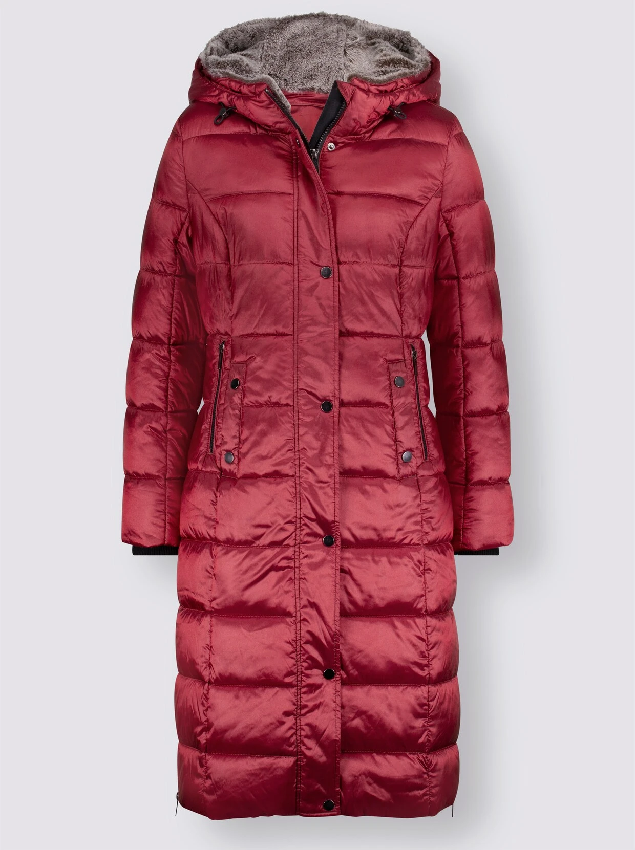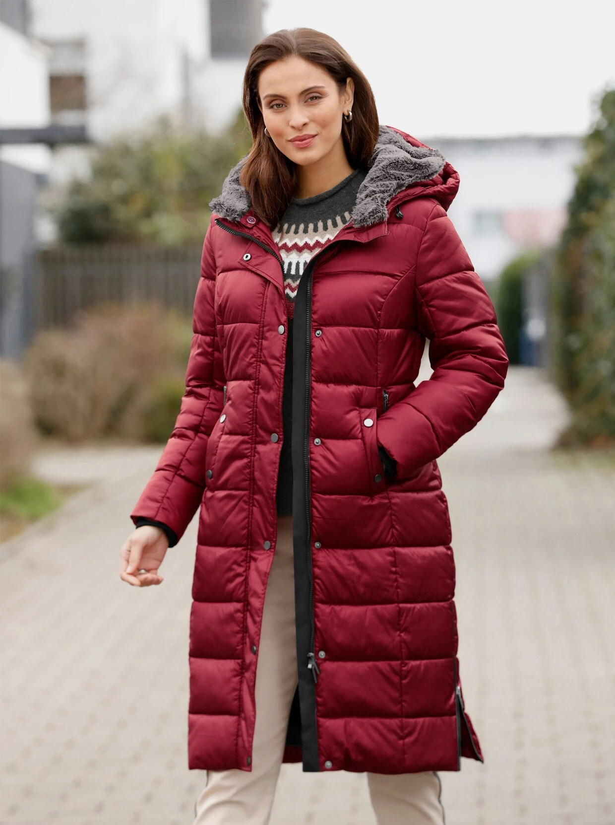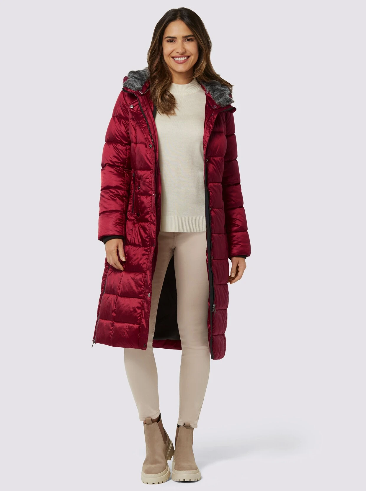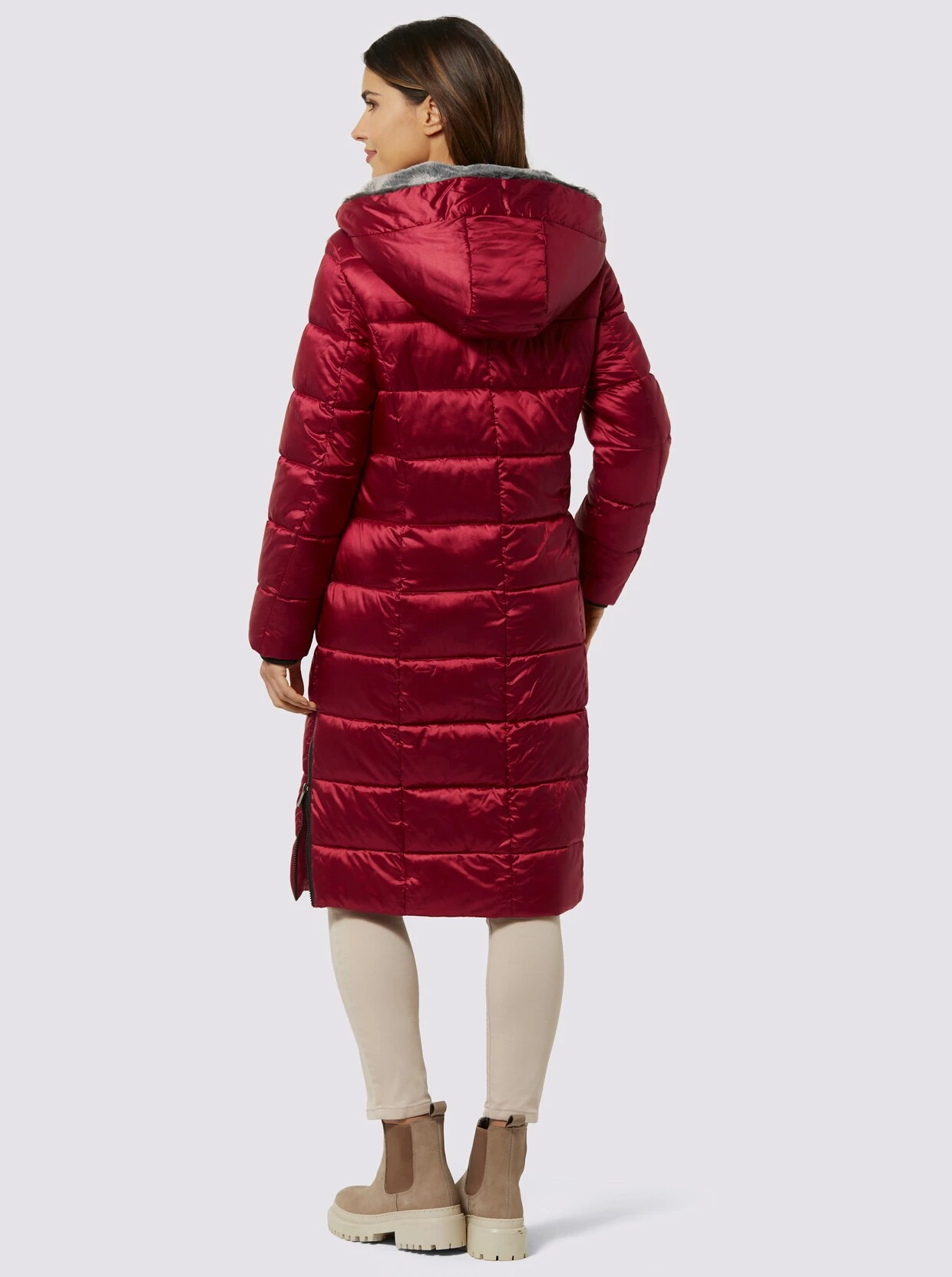 Dieser edel schimmernde Steppmantel hält Sie wunderbar warm und sieht zudem umwerfend gut aus – einfach der perfekte Begleiter für kalte Wintertage! Doppelkapuze mit flauschigem, herausknöpfbarem Futter aus Pelz-Imitat, Tunnelzug und Metallstoppern. Angenehm wärmender Stehkragen und durch Druckknopfleiste verdeckter 2-Wege-Reißverschluss. 2 Reißverschluss- und 2 Druckknopf-Taschen vorne sowie 1 Tasche im Innenfutter. Innenliegende, elastische Strickbündchen an den Ärmelabschlüssen. Die dekorativen Reißverschlüsse seitlich am Saum sorgen für optimale Bewegungsfreiheit. Teilungsnähte für eine tolle Passform.