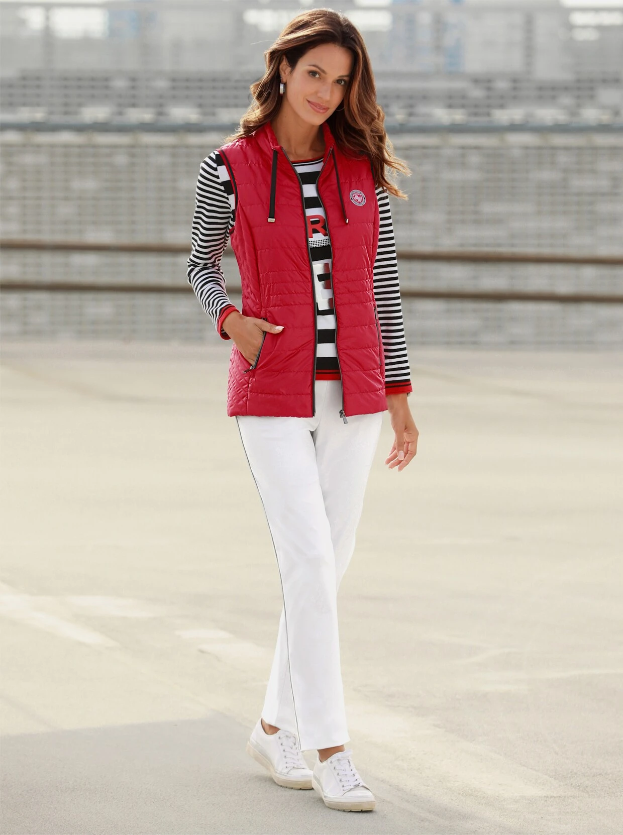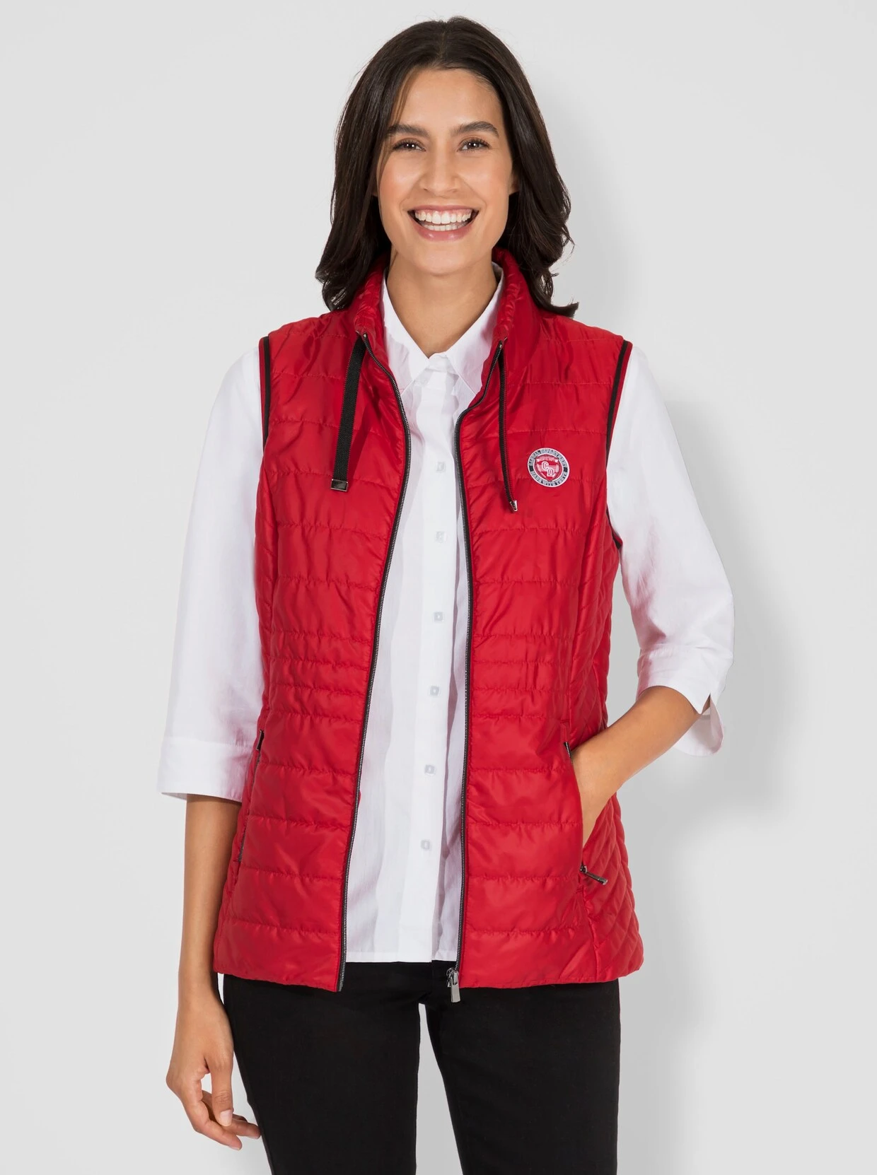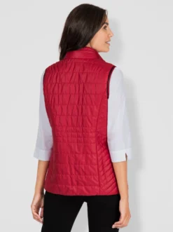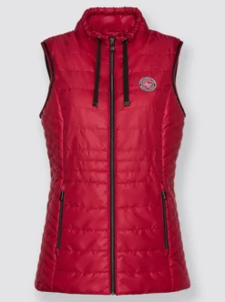 Dezent glänzende Weste im figurfreundlichen Steppmuster. Stehkragen mit Tunnelzug und Zierband. Durchgehender Reißverschluss. 2 seitliche Reißverschluss-Taschen sowie 1 praktische Innentasche. Die Wiener Nähte vorne und hinten sorgen für einen optimalen Sitz.