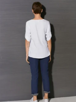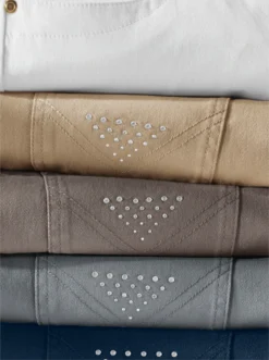 Gerade geschnittene Jeans mit rückwärtigem Dehnbund, Gürtelschlaufen sowie Knopf- und Reißverschluss vorne. Glitzersteinchen an den Gesäßtaschen. Der Sattel hinten verleiht optimale Passform. Fußweite ca. 42 cm.