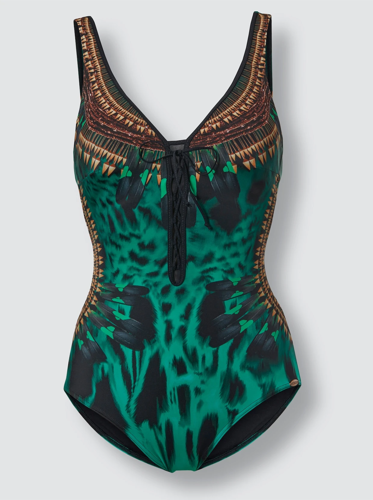 Badeanzug von Sunflair mit effektvollem Druckmuster am Dekolleté und an den Seiten. Den V-Ausschnitt zieren zarte Mesh-Einsätze und eine verführerische Schnürung. Verstellbare Träger und Softschalen. Gerader Rückenausschnitt.