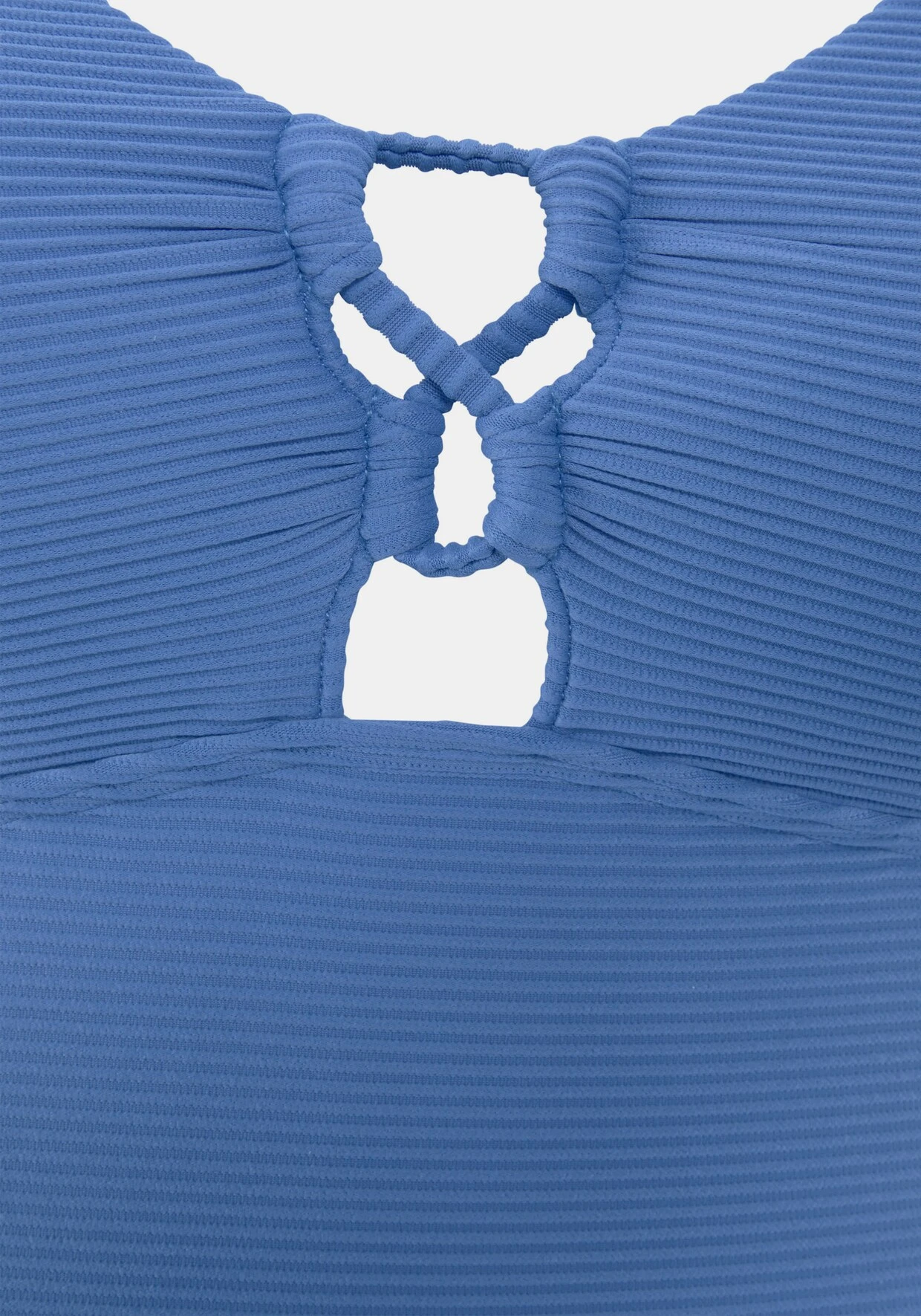 Aus modischer Strukturware mit Zierschnürung vorn am Dekolleté. Eingearbeitete Softcups und seitliche Stäbchen für guten Halt. Shaping-Einsatz vorn für eine schlanke Silhouette. Im Rücken abnehm- und verstellbare Träger, gekreuzt oder gerade tragbar.