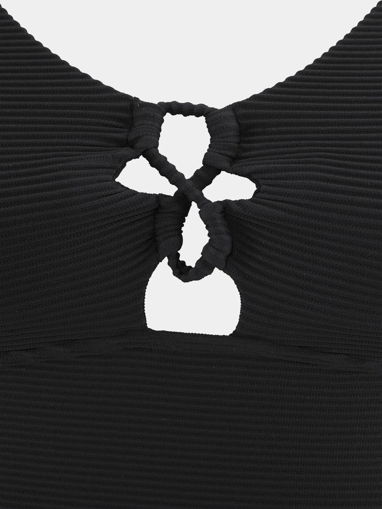 Aus modischer Strukturware mit Zierschnürung vorn am Dekolleté. Eingearbeitete Softcups und seitliche Stäbchen für guten Halt. Shaping-Einsatz vorn für eine schlanke Silhouette. Im Rücken abnehm- und verstellbare Träger, gekreuzt oder gerade tragbar.