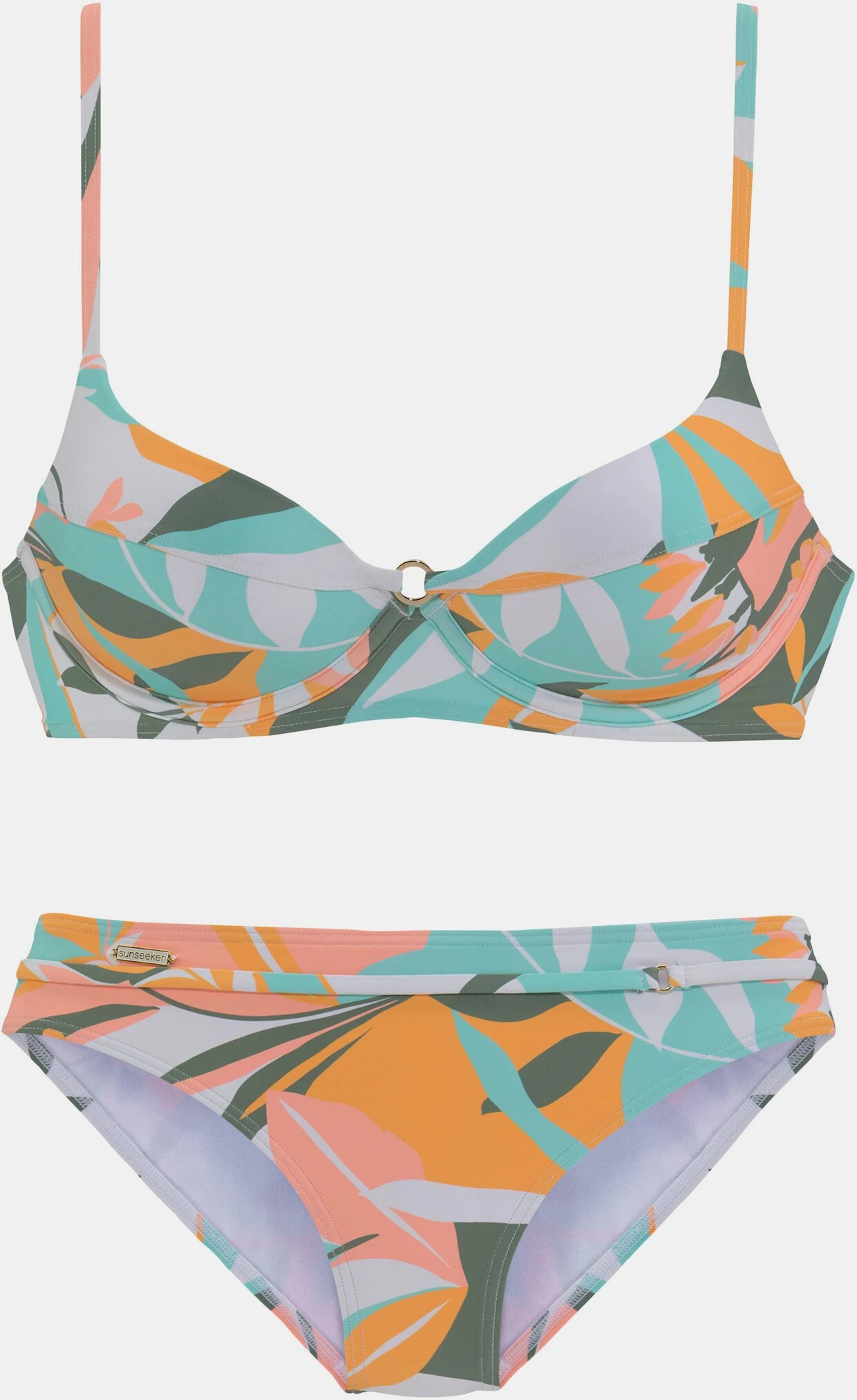 Der Bügel-Bikini von Sunseeker ist mit seinem trendigen Blätterdesign ein richitger Hingucker. Die wattierten Cups und die verstellbaren Träger bieten einen guten Halt. Die Hose ist mit einem Ziergürtel versehen. Softe Microfaser Qualität. Obermaterial: 84% Polyamid, 16% Elasthan. Futter: 100% Polyamid. Wattierung: 100% Polyester