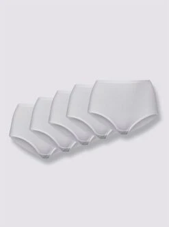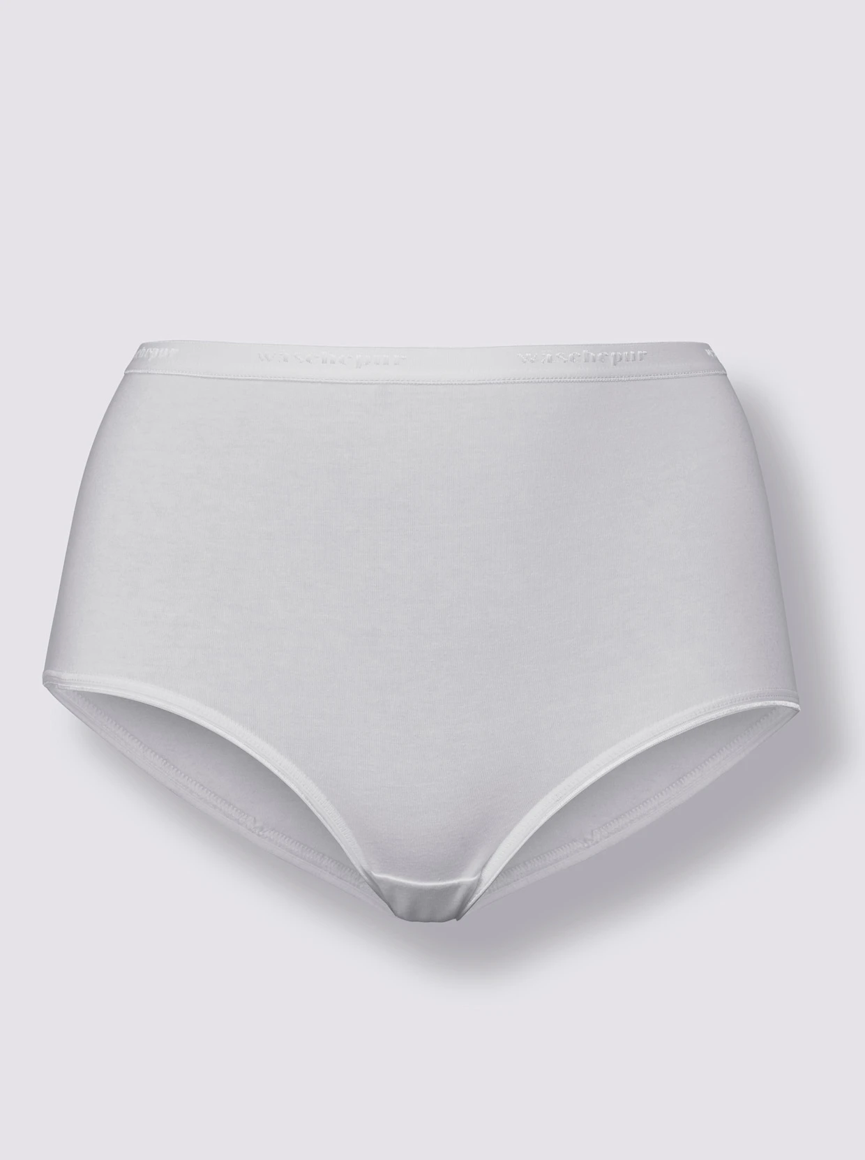 Wie praktisch: diese Taillenslips von wäschepur können Sie direkt in der 5-Stück-Packung kaufen. Mit elastischen Bund- und Beinabschlüssen und glänzendem wäschepur-Druck am Bund. Doppelzwickel.