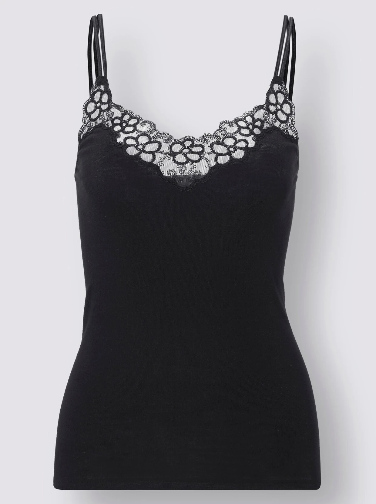 Hingucker bei diesem Trägerhemd von Comazo im Doppelpack ist die edle Tüllstickerei-Spitze vorne am Ausschnitt. Mit Doppelträgern. Feinripp-Qualität.