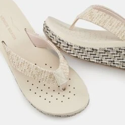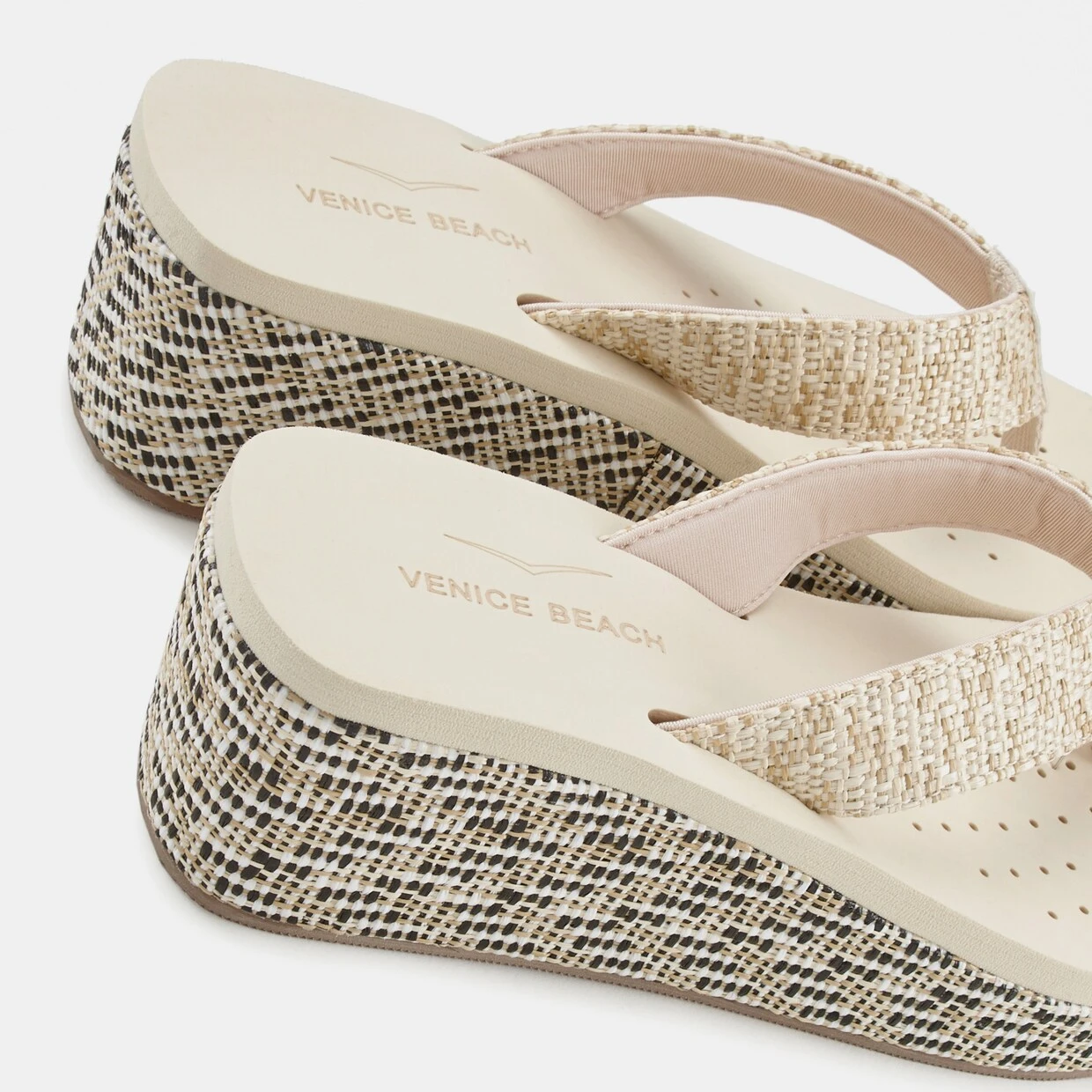 Zehentrenner mit Keilabsatz VEGAN von VENICE BEACH. Absatzhöhe ca. 6,5 cm. Obermaterial und Futter aus Textil. Decksohle und Laufsohle aus Synthetik.