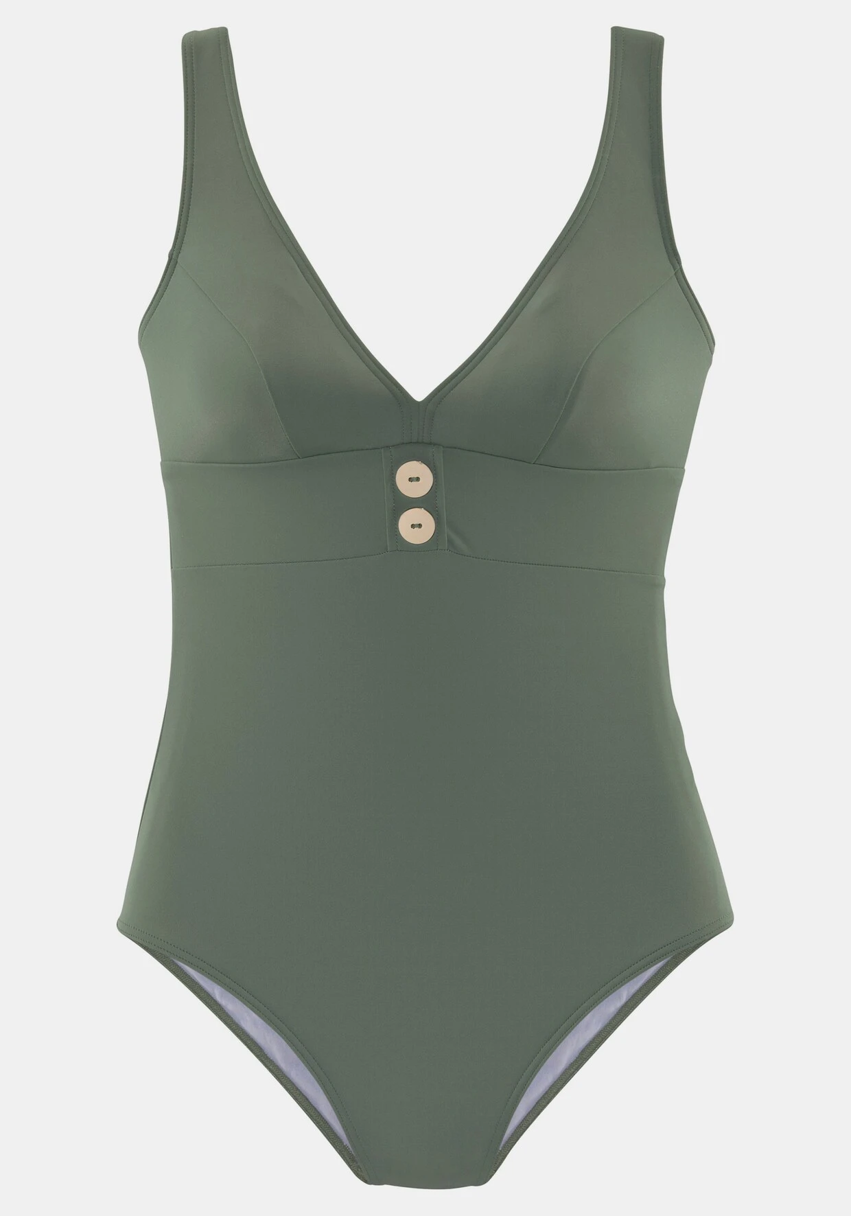 Modischer Badeanzug von Vivance. Verstellbare Träger und integrierte Softcups. Tiefer V-Ausschnitt mit Dekoknöpfen. Tiefer, abgerundeter Rückenausschnitt. Klassische Passform. Angenehme Qualität.