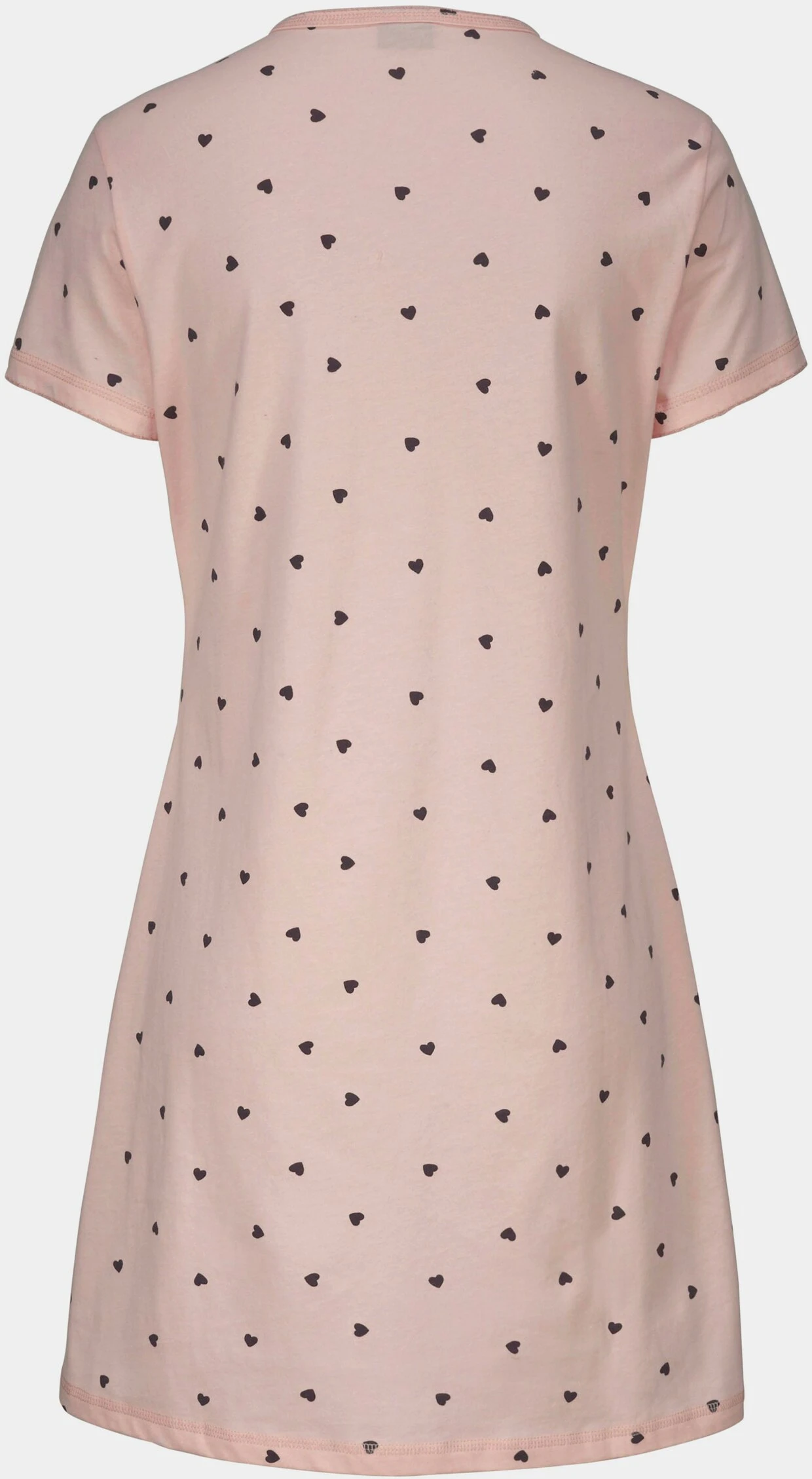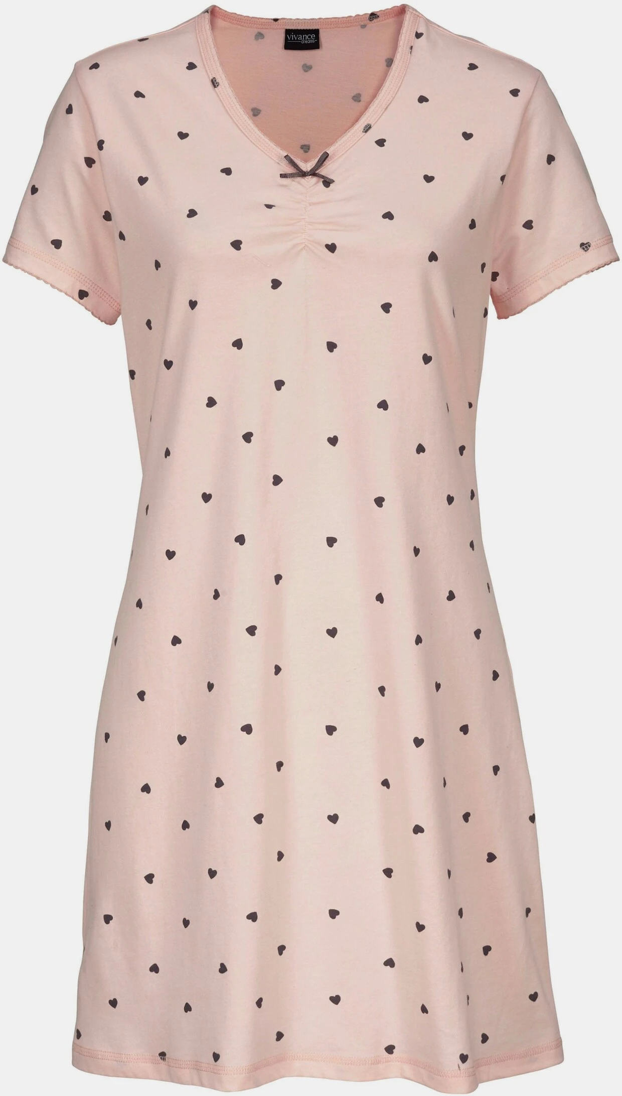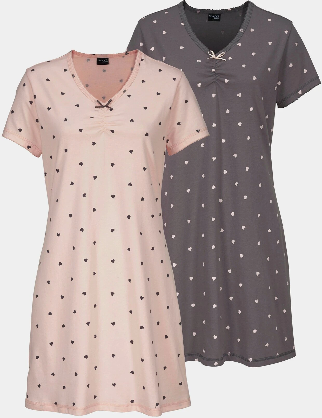 Tolles Nachthemd von Vivance Dreams im Dopplepack! Mit V-Ausschnitt, kleiner Raffung und süßer Zierschleife. Ausschnitt und kurze Ärmel mit hübscher Einfassung. Allover bedruckt mit süßem Herzchenprint. Aus weichem Single Jersey aus 100% Baumwolle.