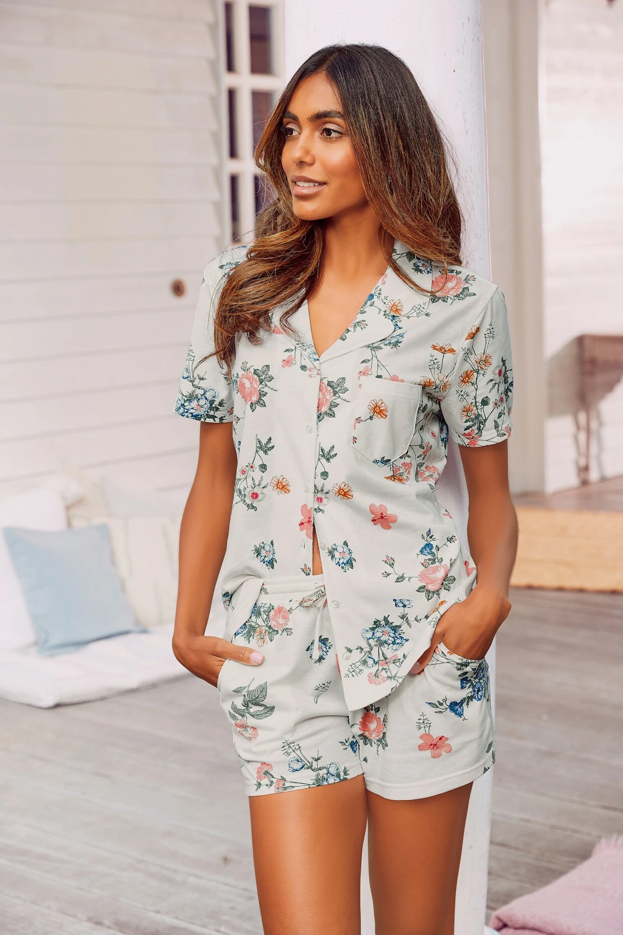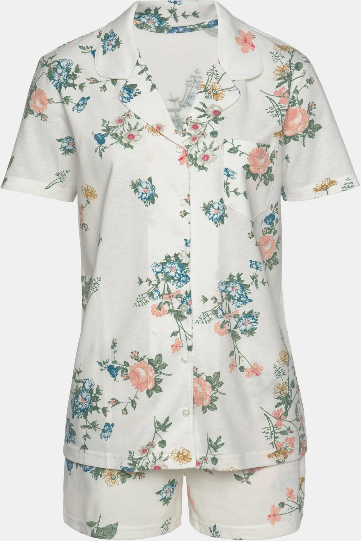 Klassischer Shorty von Vivance Dreams. Kurzarmshirt mit Reverskragen, durchgehender Knopfleiste und aufgesetzter Brusttasche. Shorts mit elastischem Tunnelzugbund. Weiche Single-Jersey-Qualität aus Baumwollmischung.