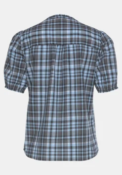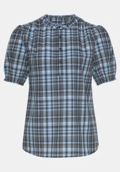 Karierte Kurzarmbluse von Vivance. Kragen mit Rünschenkante. Durchgehende Knopfleiste. Ärmelabschlüsse mit Gummibund. Leicht gerundeter Saum. Für wärmere Tage. Trageangenehme Baumwollqualität.