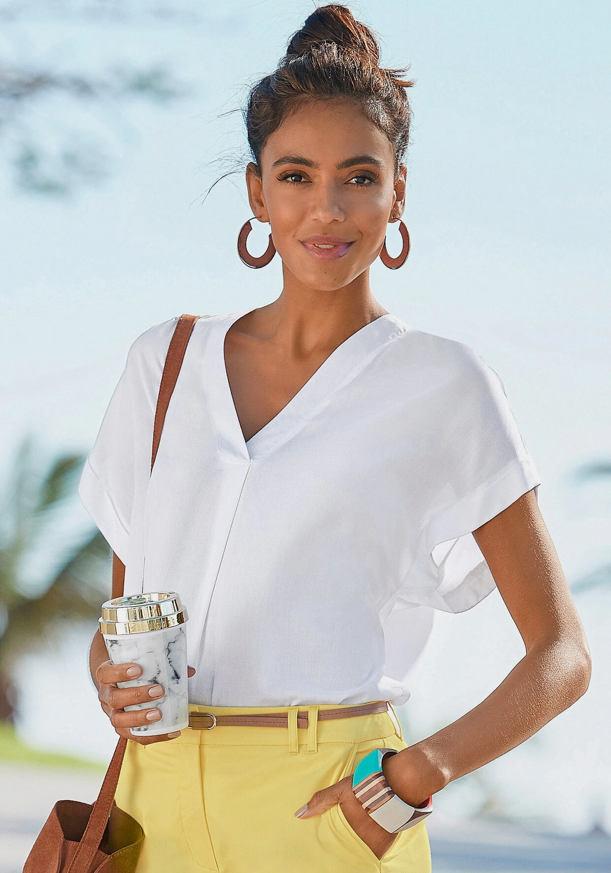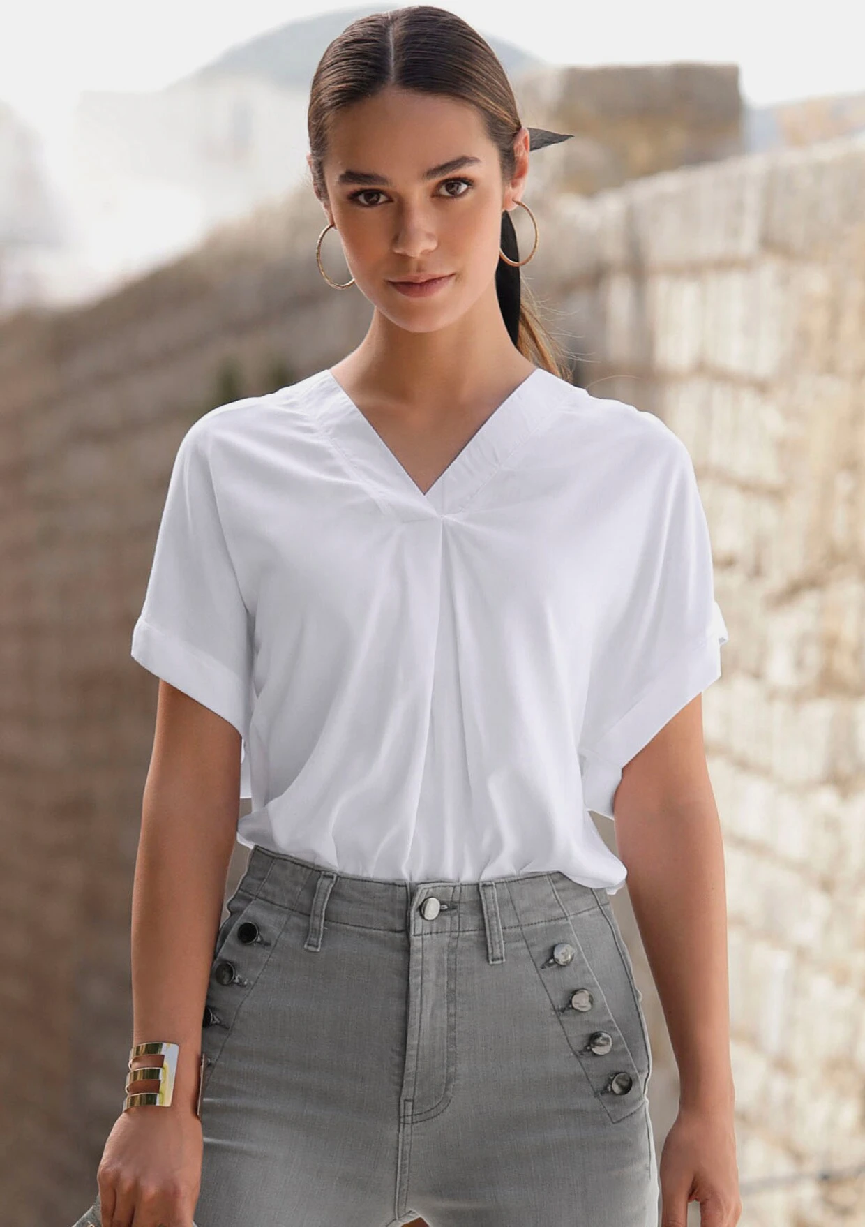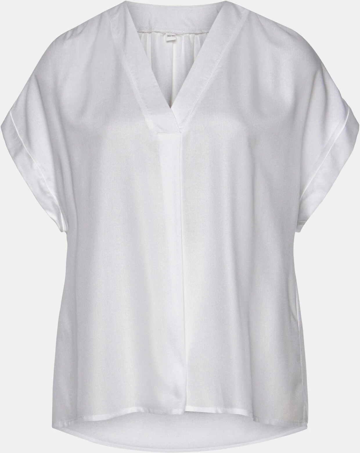 Bluse von Vivance mit V-Ausschnitt mit breiter Blende. Kurze, weite Ärmel mit fixiertem Umschlag. Länge ca. 66 cm. Supersofte, gewebte Qualität aus100% Viskose.