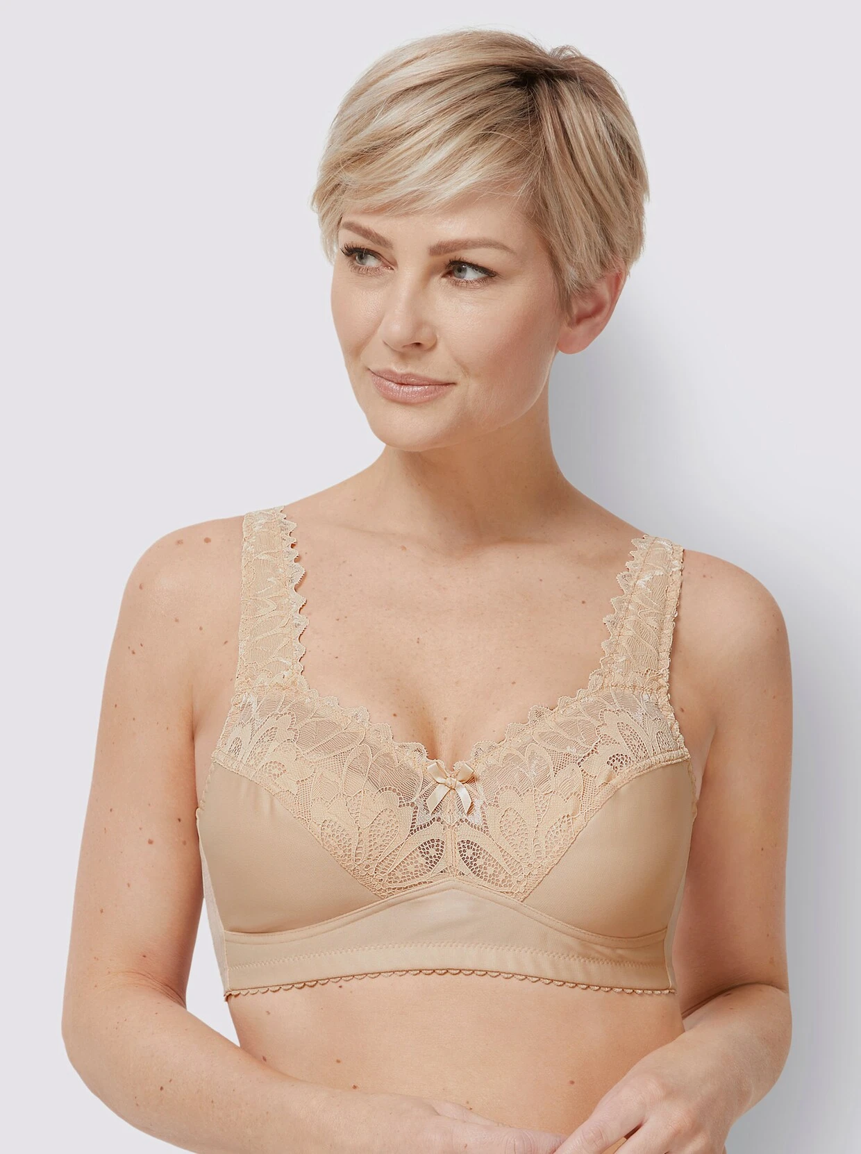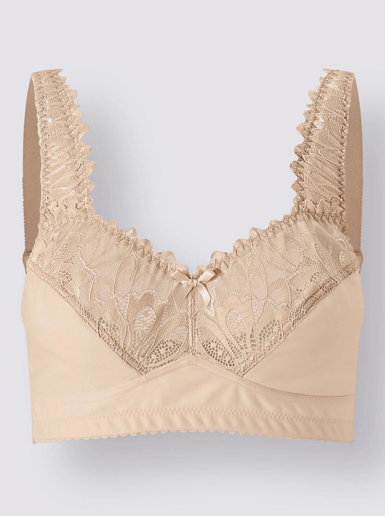 BH ohne Bügel von wäschepur mit wunderschöner, elastischer Spitze am Dekolleté und bis in die breiten, wattierten und im Rücken verstellbaren Träger verlaufend. 2-geteilte Cups.
