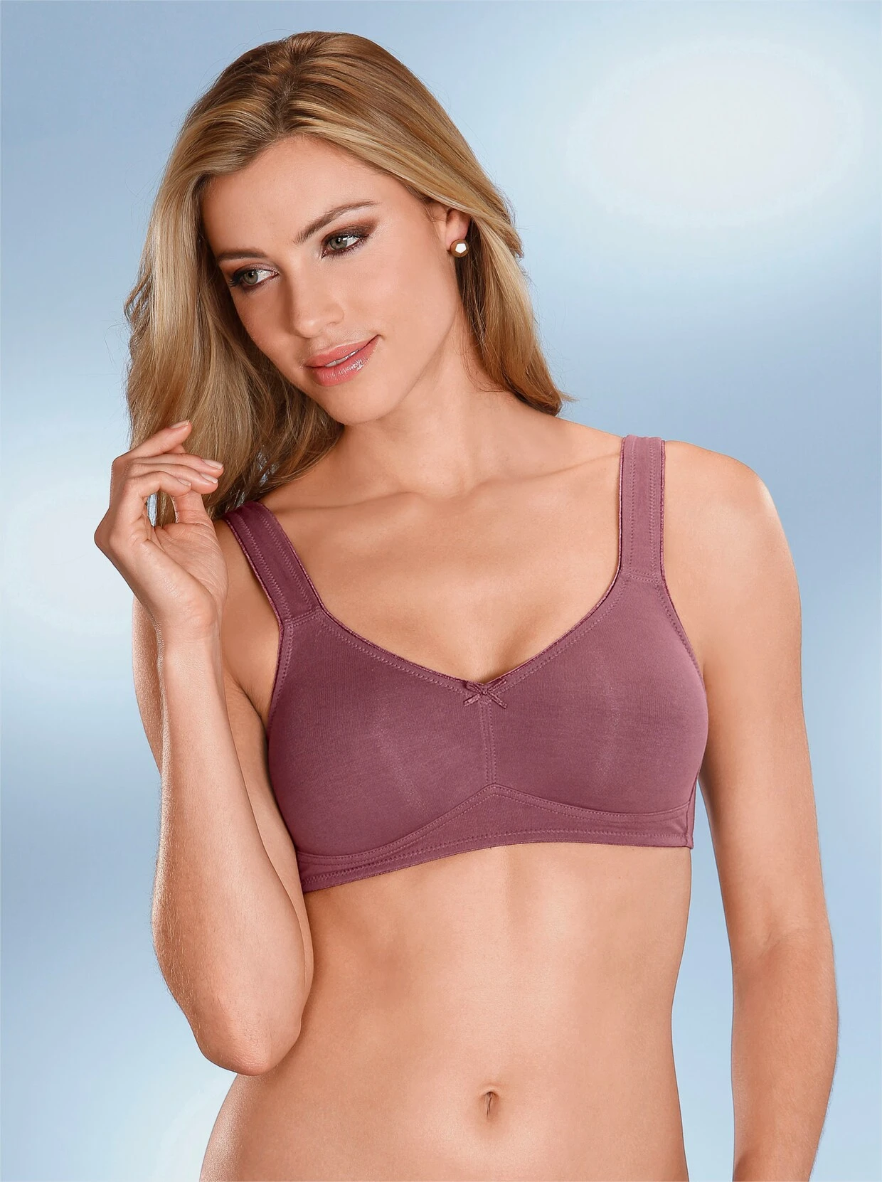 Wohlfühlen im Alltag: BH ohne Bügel von wäschepur mit hohem Baumwollanteil und doppelt gemoldeten Cups. Die Träger sind im Rücken verstellbar.