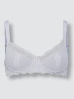 Mit floraler, elastischer Spitze am Dekolleté: Bügel-BH von wäschepur in unserer Form ANGELIT mit 2-geteilten Cups. Die Untercups ziert ein modischer Tüll-Einsatz mit Pünktchen und einem dekorativen Zierband. Süß: das kleine Schleifchen zwischen den Cups. Die Träger sind im Rücken verstellbar.