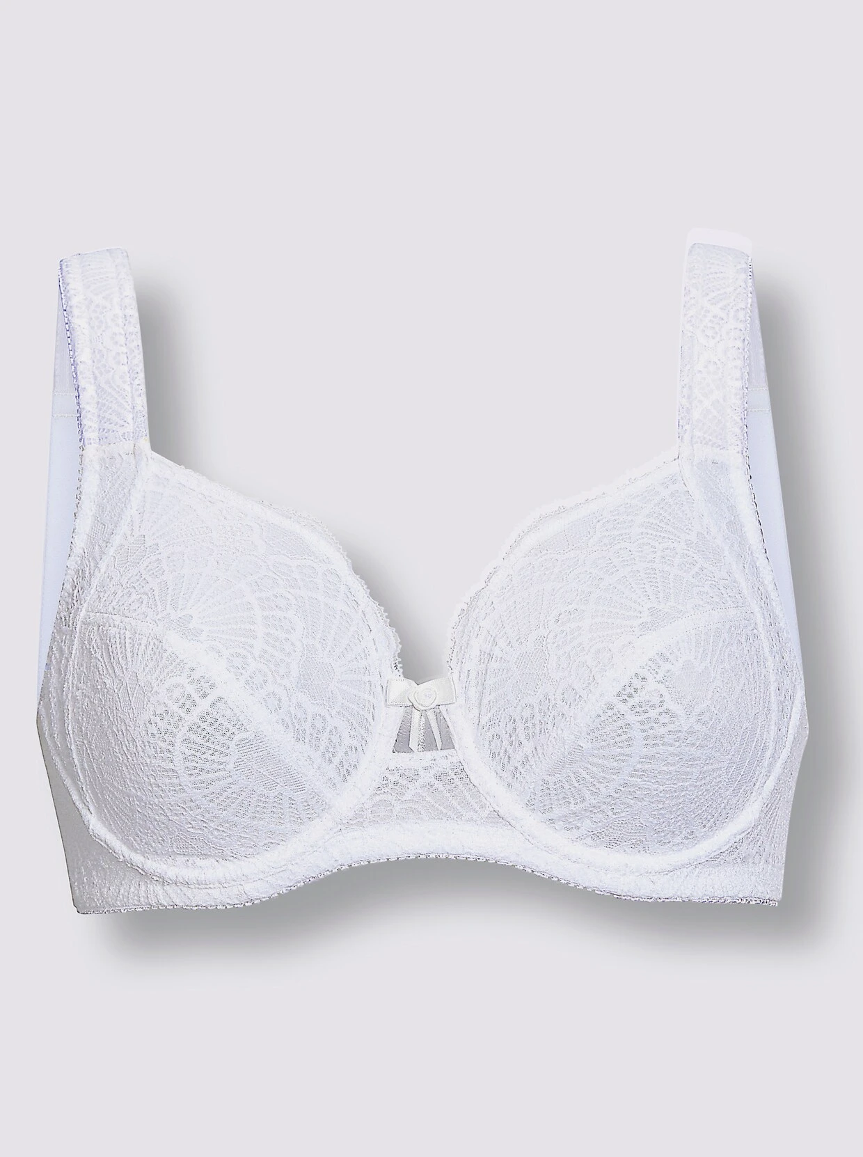 Entlastungs-BH mit Bügel von wäschepur. Die 2-geteilten Cups lassen im oberen Teil leicht die Haut durchschimmern und sind mit einer filigranen Spitze verziert, die bis in die im Rücken verstellbaren Träger reicht. Die Untercups sind blickdicht unterlegt.