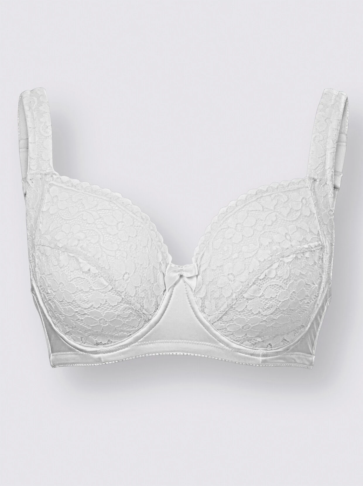 Von wäschepur: Entlastungs-BH mit Bügel. Die 2-geteilten Cup sind mit einer filigranen Spitze überzogen, die bis in die weich gepolsterten Träger reicht, die im Rücken verstellt werden können. Die Untercups sind blickdicht unterlegt.