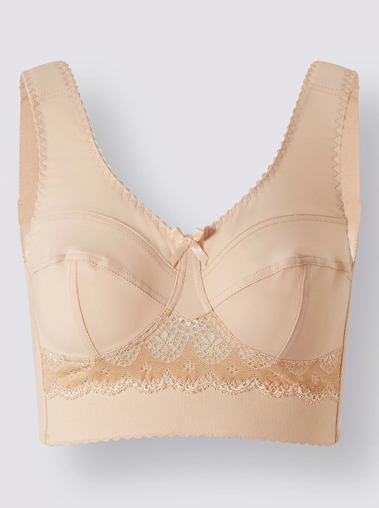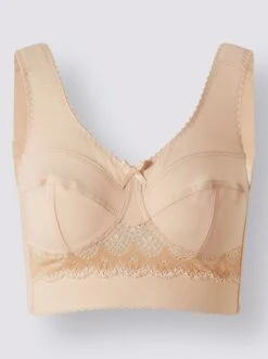 Entlastungs-BH ohne Bügel von wäschepur mit spitzenbesetztem, breitem, elastischem Unterbrustband. 3-geteilte Cups. Breite, gefütterte Komfortträger.