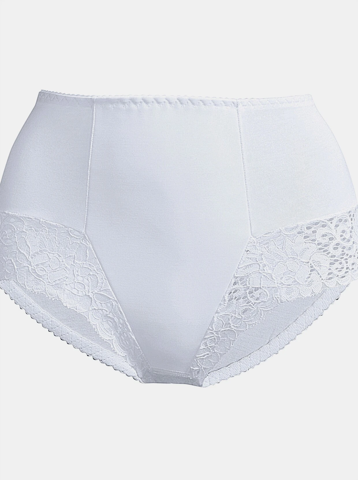 Für einen flacheren Bauch: Formslip von wäschepur mit verstärkter Vorderpatte. Elastische Spitzen-Einsätze am Bein. Angenähter Gummibund. Doppelter Baumwollzwickel. Single-Jersey.