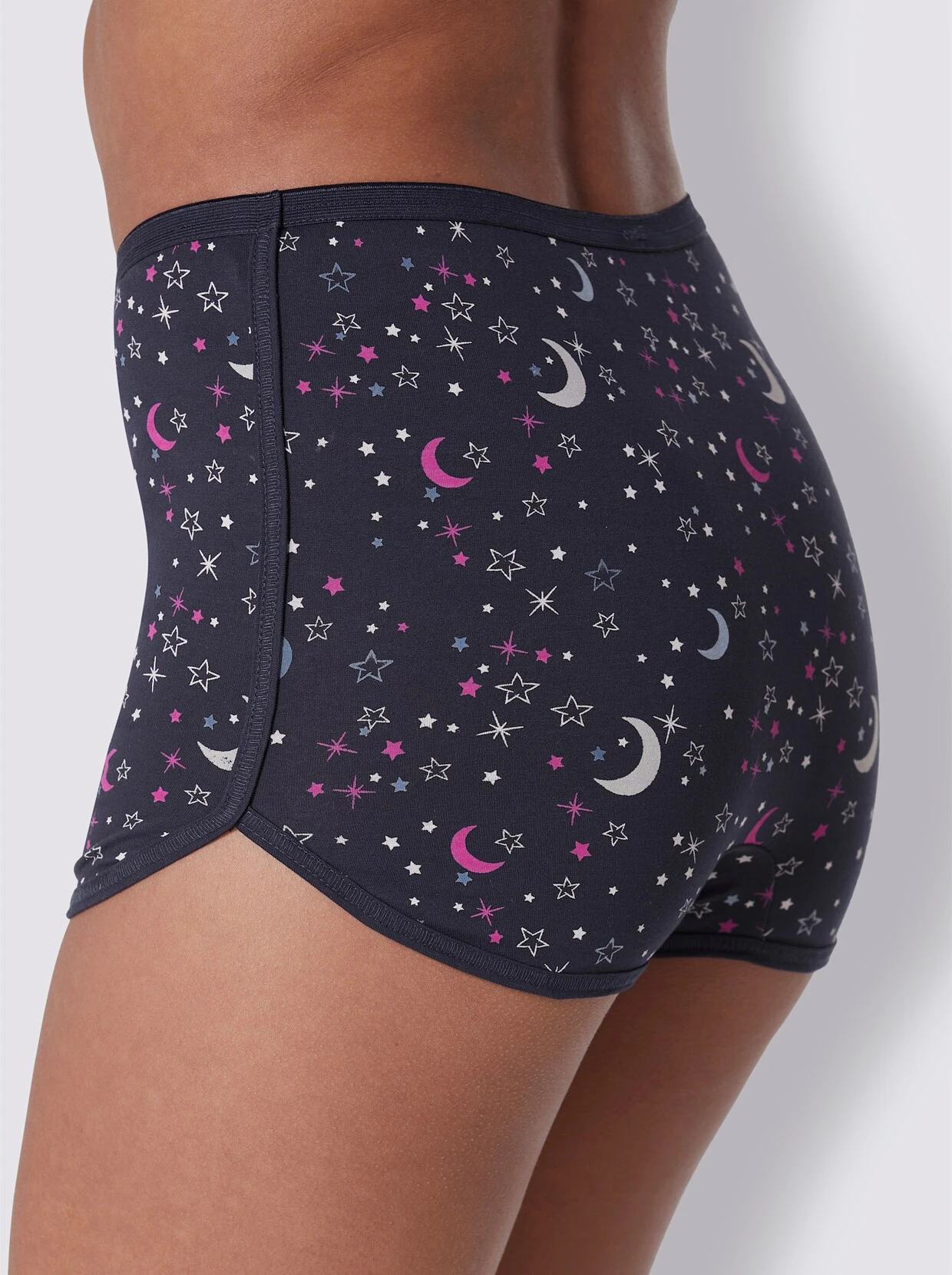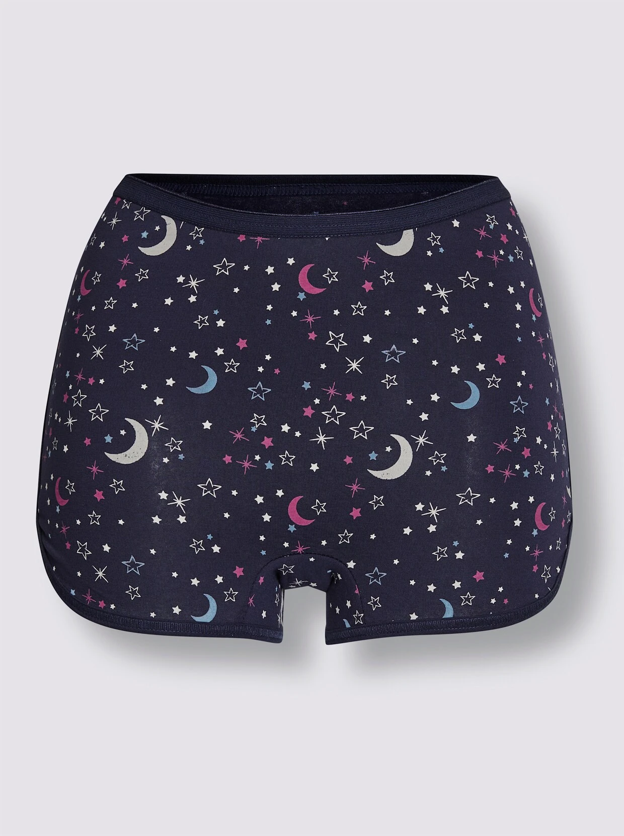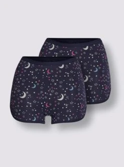 Hipster im Doppelpack von wäschepur. Komplett im schönen Druck-Dessin. Der breite, flache Bund ist elastisch und absolut bequem. Mit elastischen Beinabschlüssen und Doppelzwickel. Trageangenehmer Single-Jersey. Unterstützt die Initiative Cotton made in Africa.