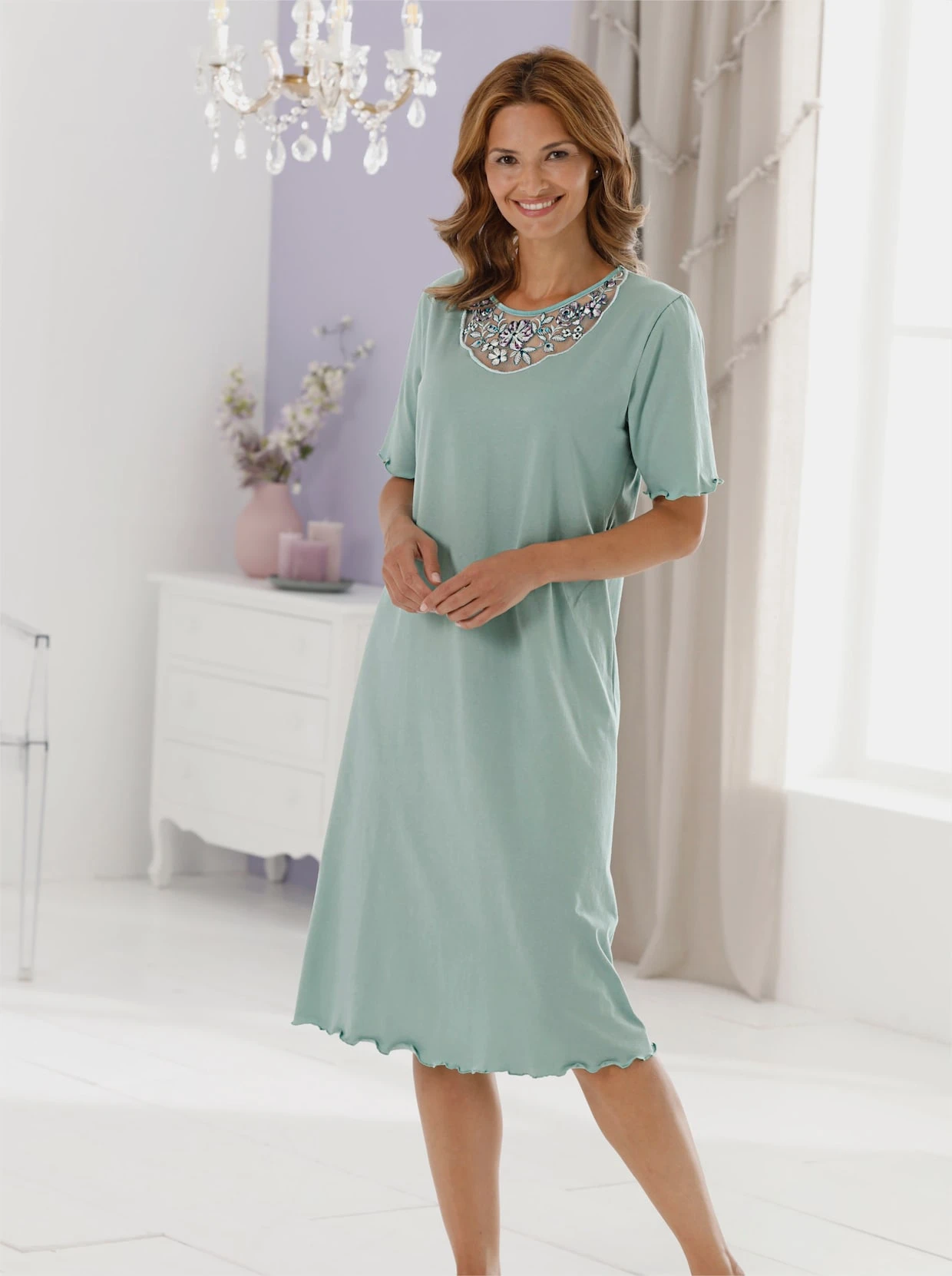 Nachthemd mit zauberhaftem Dekolleté: Der wellenförmige Spitzeneinsatz mit mehrfarbiger Stickerei macht es zu etwas ganz Besonderen! Rollsaum an den Abschlüssen. Single-Jersey.