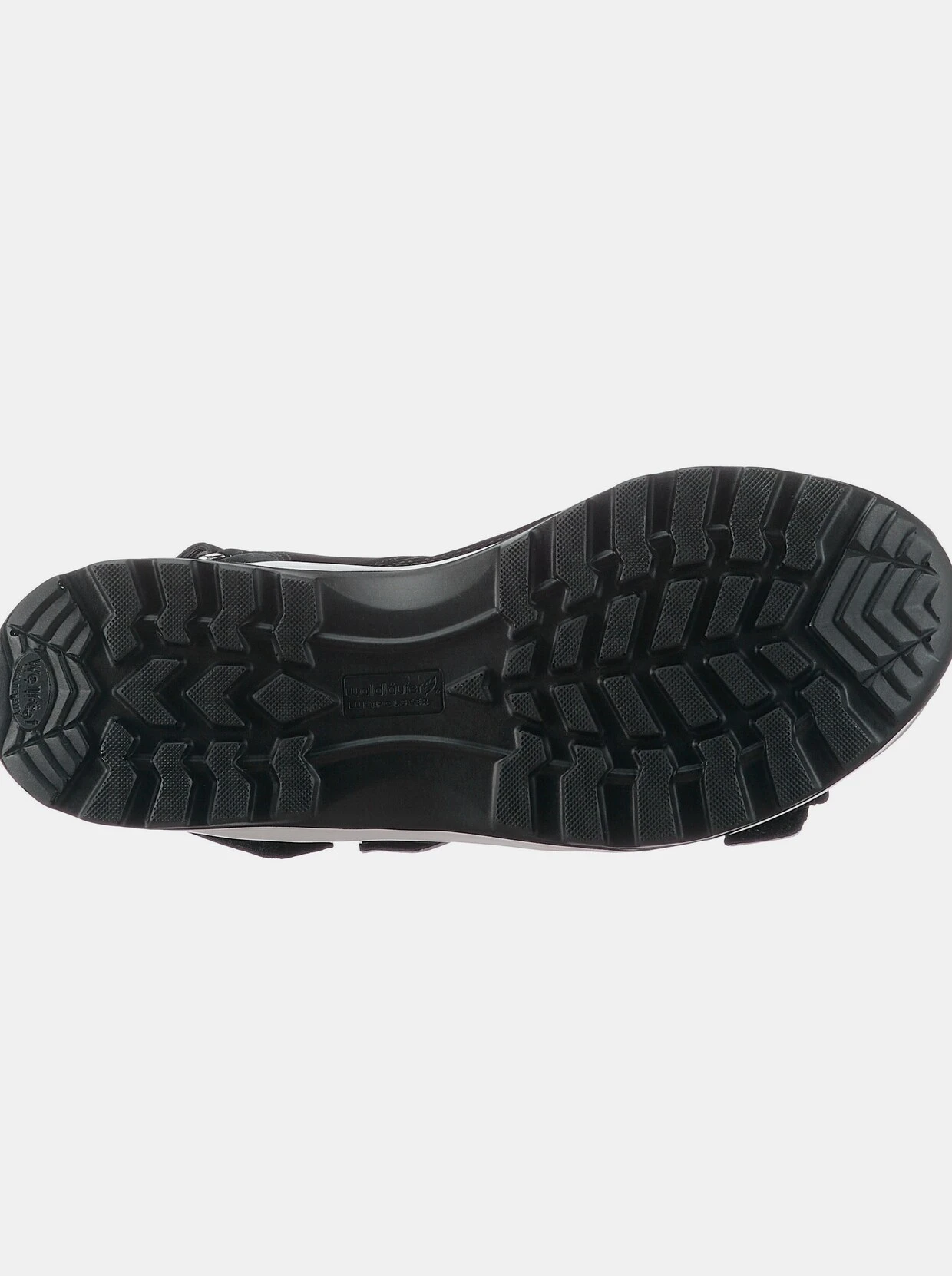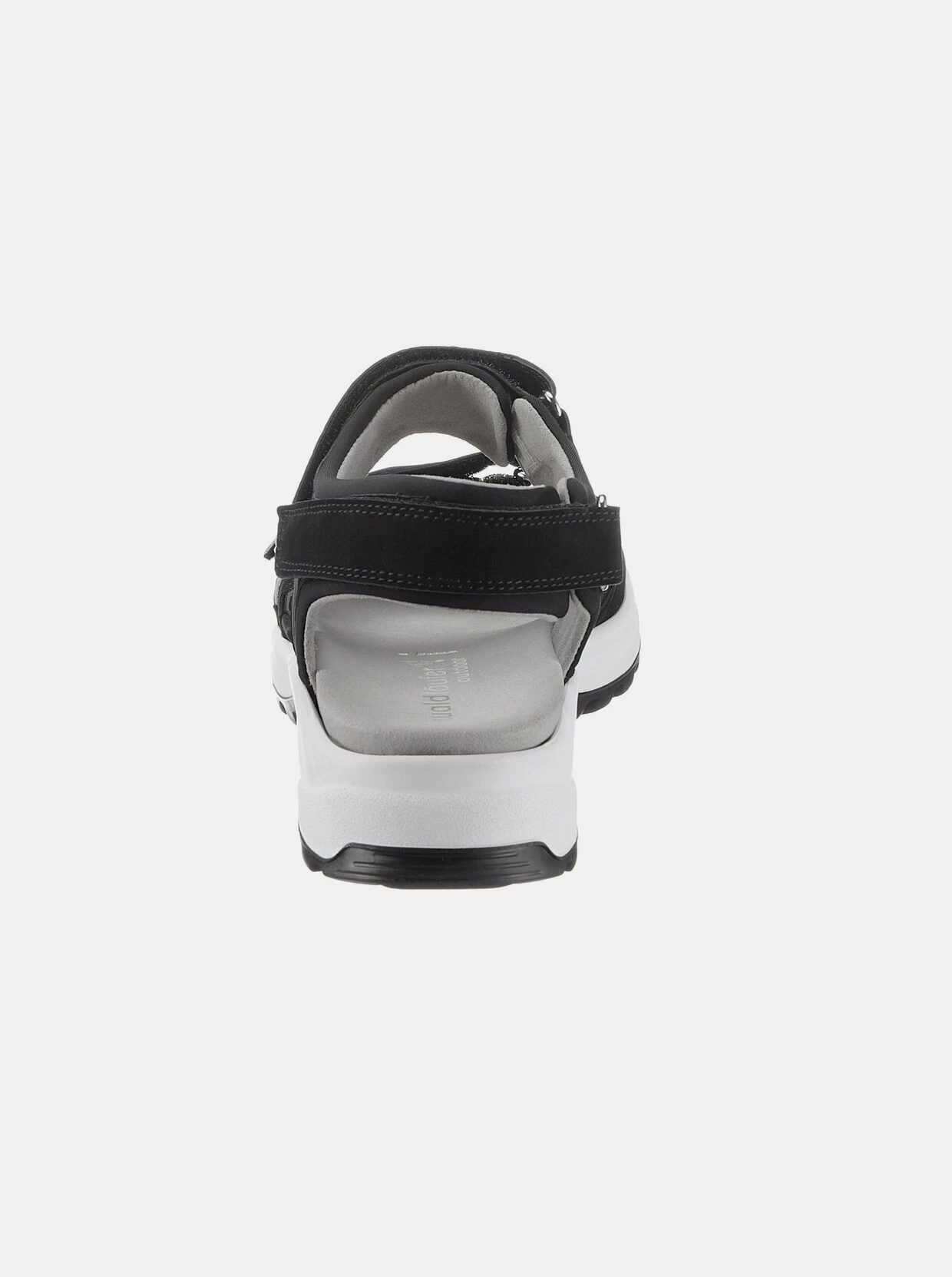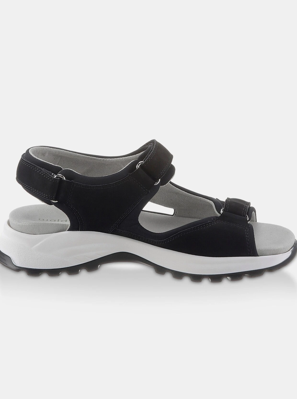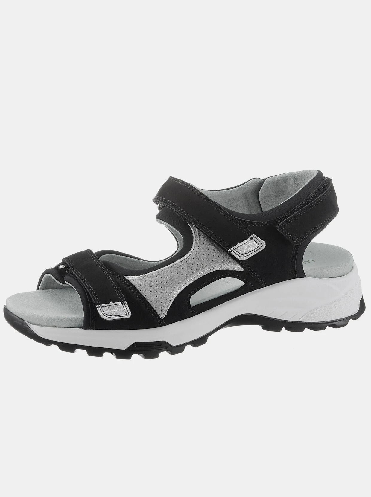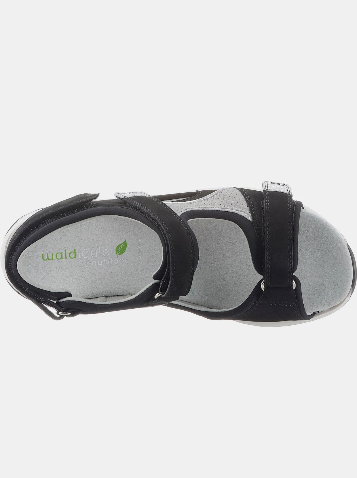 Sportive Sandale von Waldläufer mit praktischem Klettverschluss. Obermaterial: Farbe Grau Veloursleder, Textil und Nubukleder, Farbe Schwarz Nubukleder und Textil. Innenausstattung: Textil, mit weich gepolstertem Wechselfußbett. Rutschhemmende PU-Laufsohle mit ca. 35 mm Absatz. Weite H.