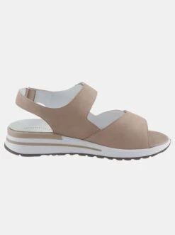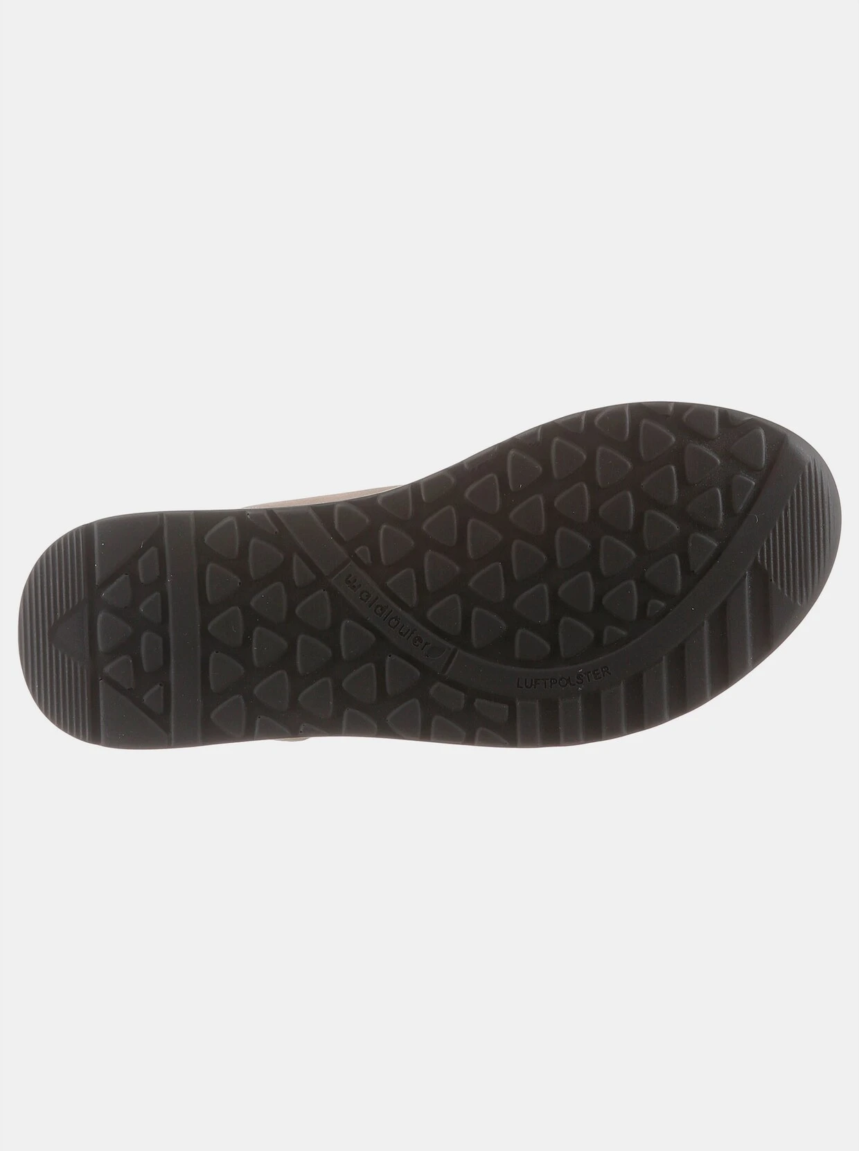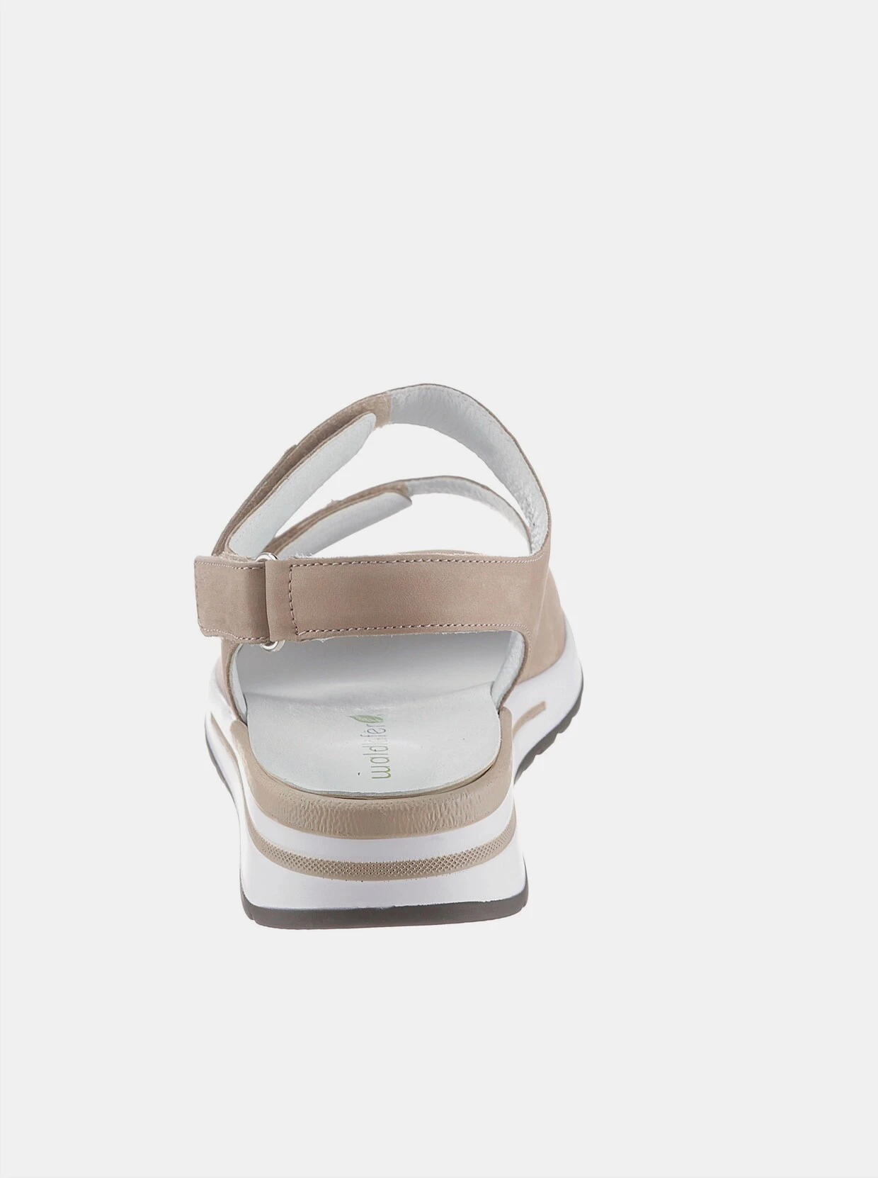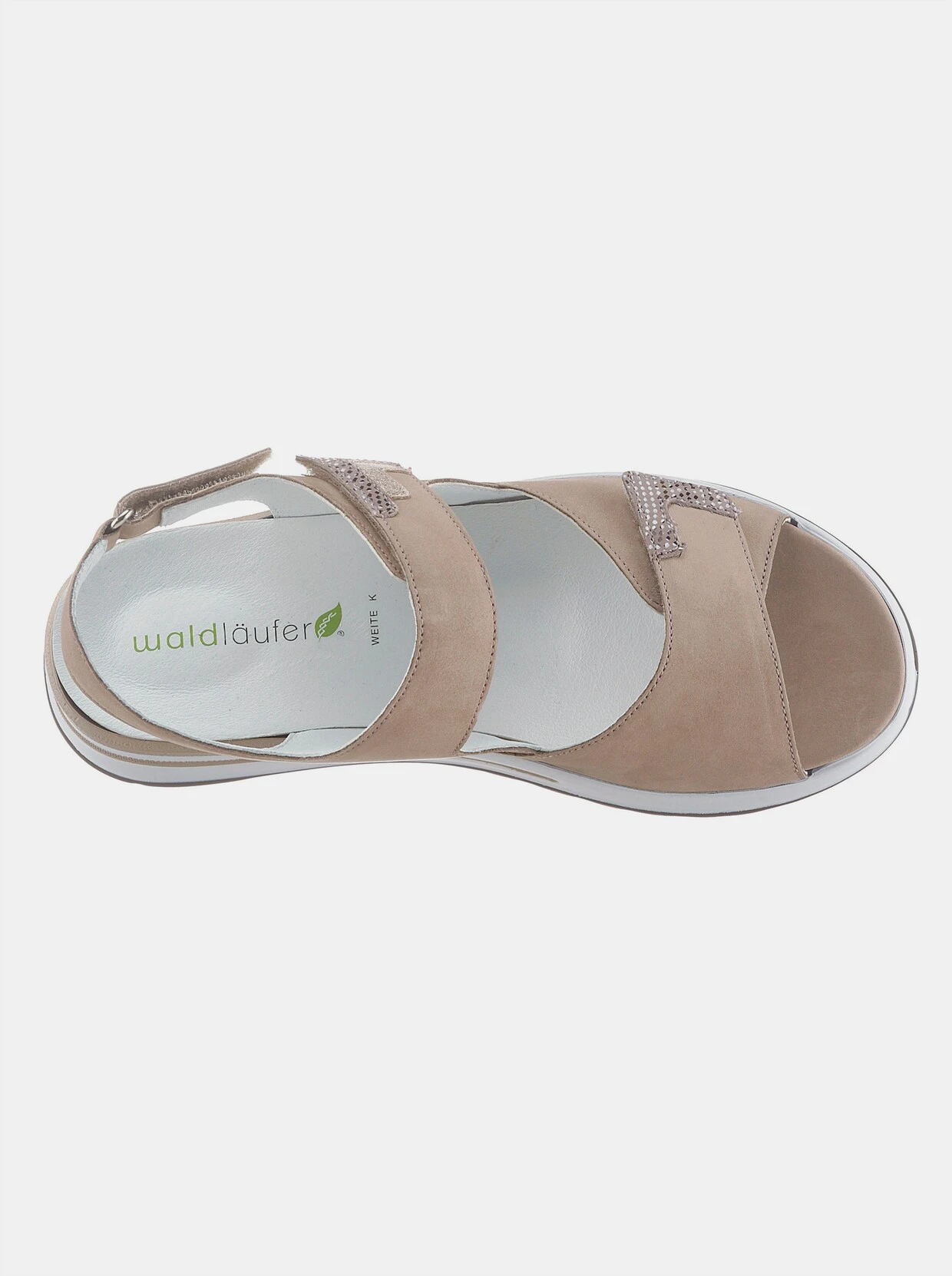 Sandale von Waldläufer mit 3 komfortablen Klettverschlüssen und verstellbarem Fersenriemchen mit Klett. Obermaterial: Farben Taupe und Marine Nubukleder, Farbe Weiß Glattleder. Atmungsaktive Leder-Innenausstattung. Trittdämpfendes Klett-Wechselfußbett mit Gewölbestütze und Pelotte. Rutschhemmende PU-Luftpolster-Laufsohle mit ca. 35 mm Absatz. Weite K.