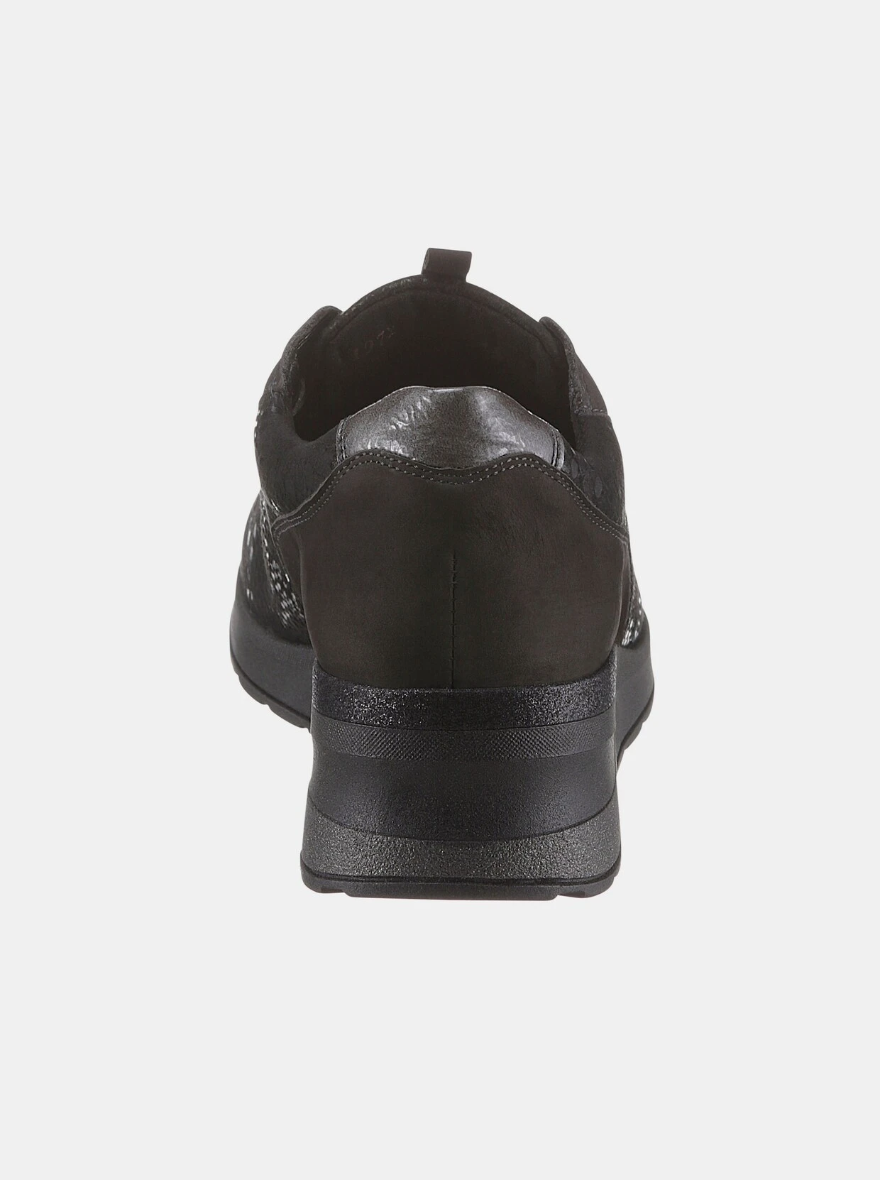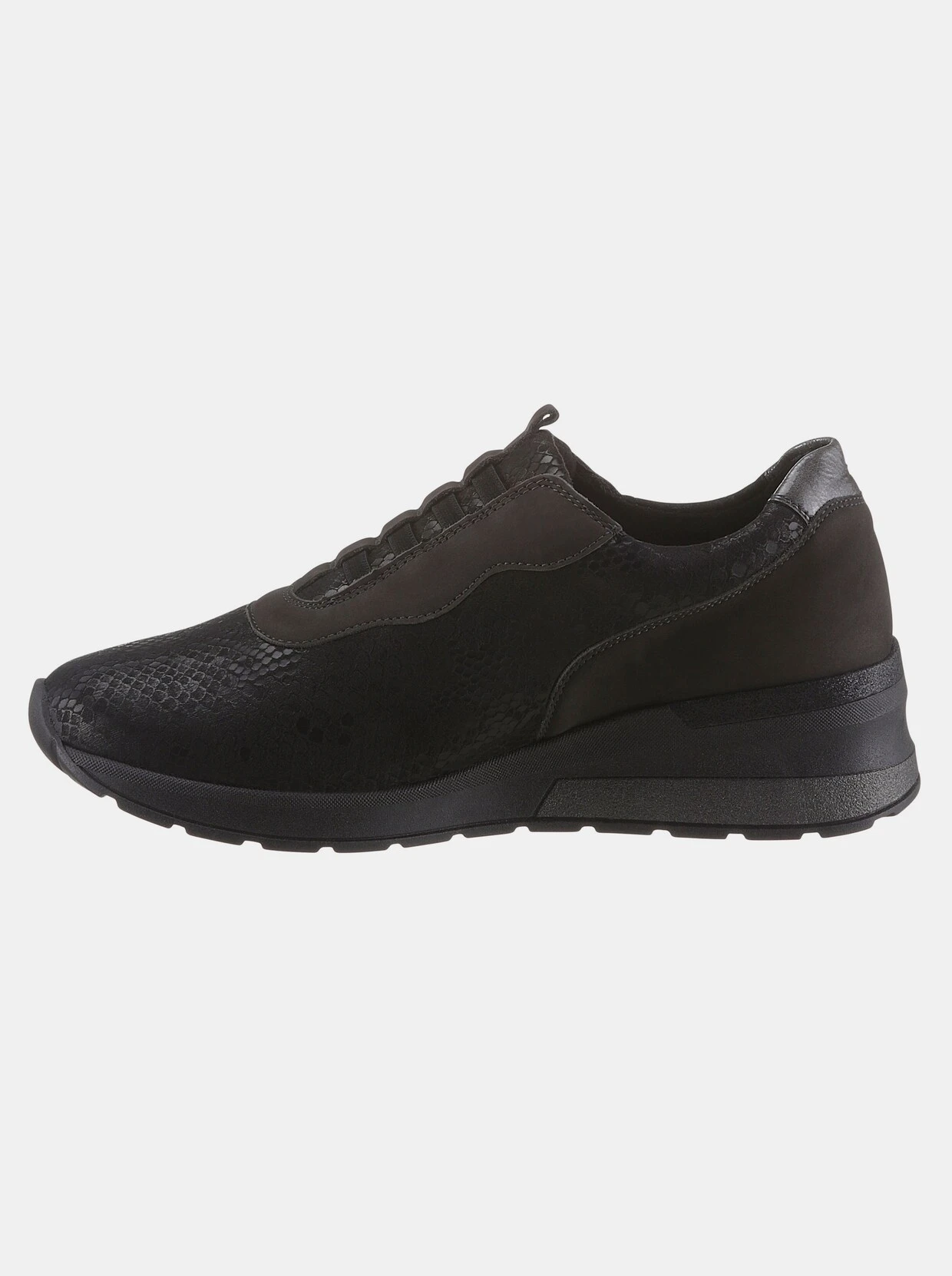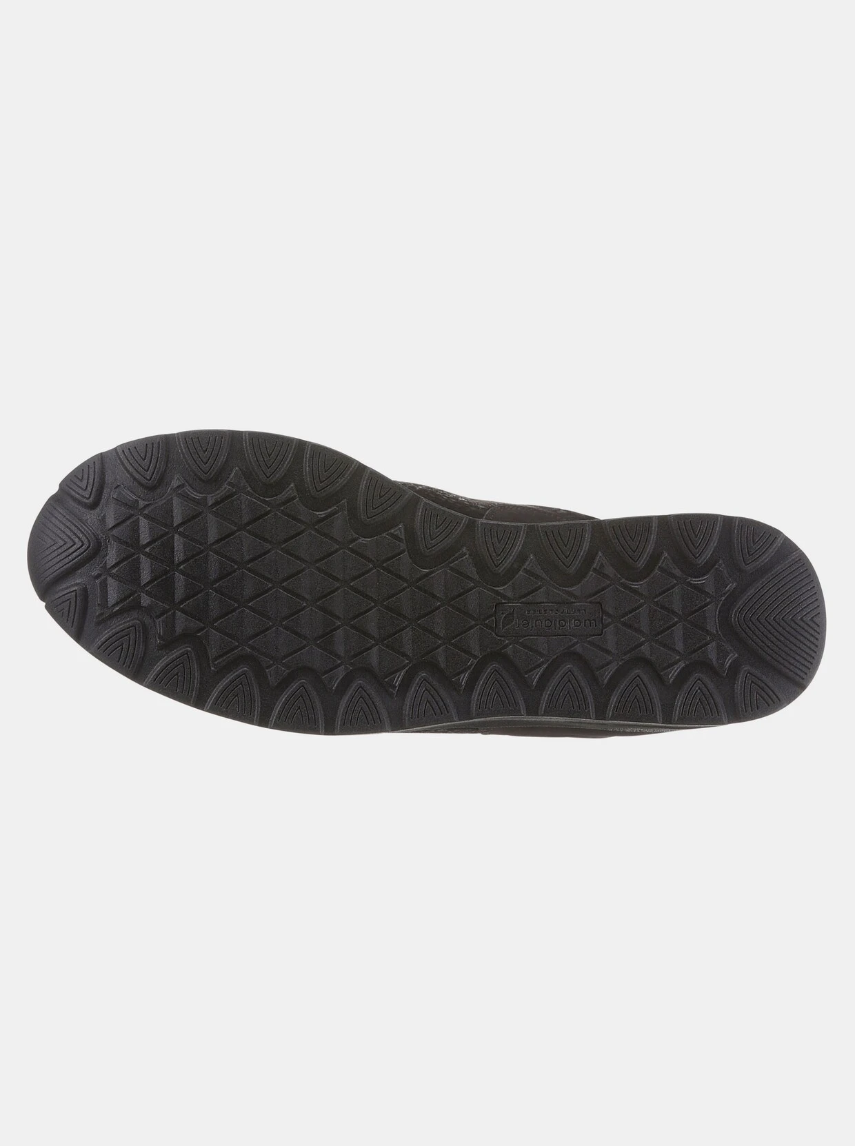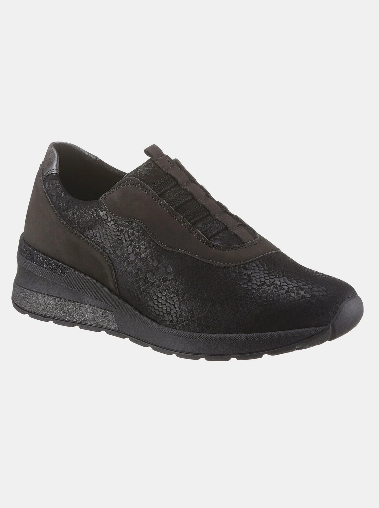 Dehnbarer Mix aus Nubukleder und Textil: Der Slipper von Waldläufer passt sich dem Fuß an. Besonders komfortabel dank fest an der Schuhzunge angenähtem Gummizug für den leichteren Einstieg und Gummizügen für besseren Halt. Weich gepolsterte Innenausstattung: Textil. Mit Wechselfußbett. Rutschhemmende PU-Luftpolster-Laufsohle mit schmückenden Akzenten. Absatz ca. 30 mm. Weite H.
